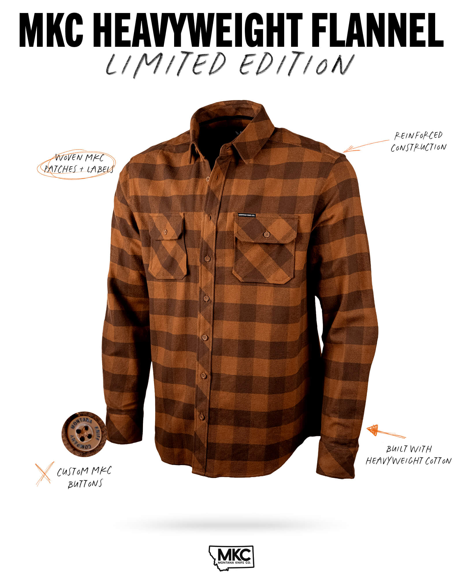 Built for the cold, made to last. The MKC Heavyweight Flannel is your go-to layer for work, a night at the local dive, or wherever your day takes you. Made from heavyweight cotton fabric and featuring two button-flap chest pockets, it delivers warmth, durability, and comfort without compromise. Available in multiple colorways, this flannel is a tough-as-nails addition to your every outfit choice.