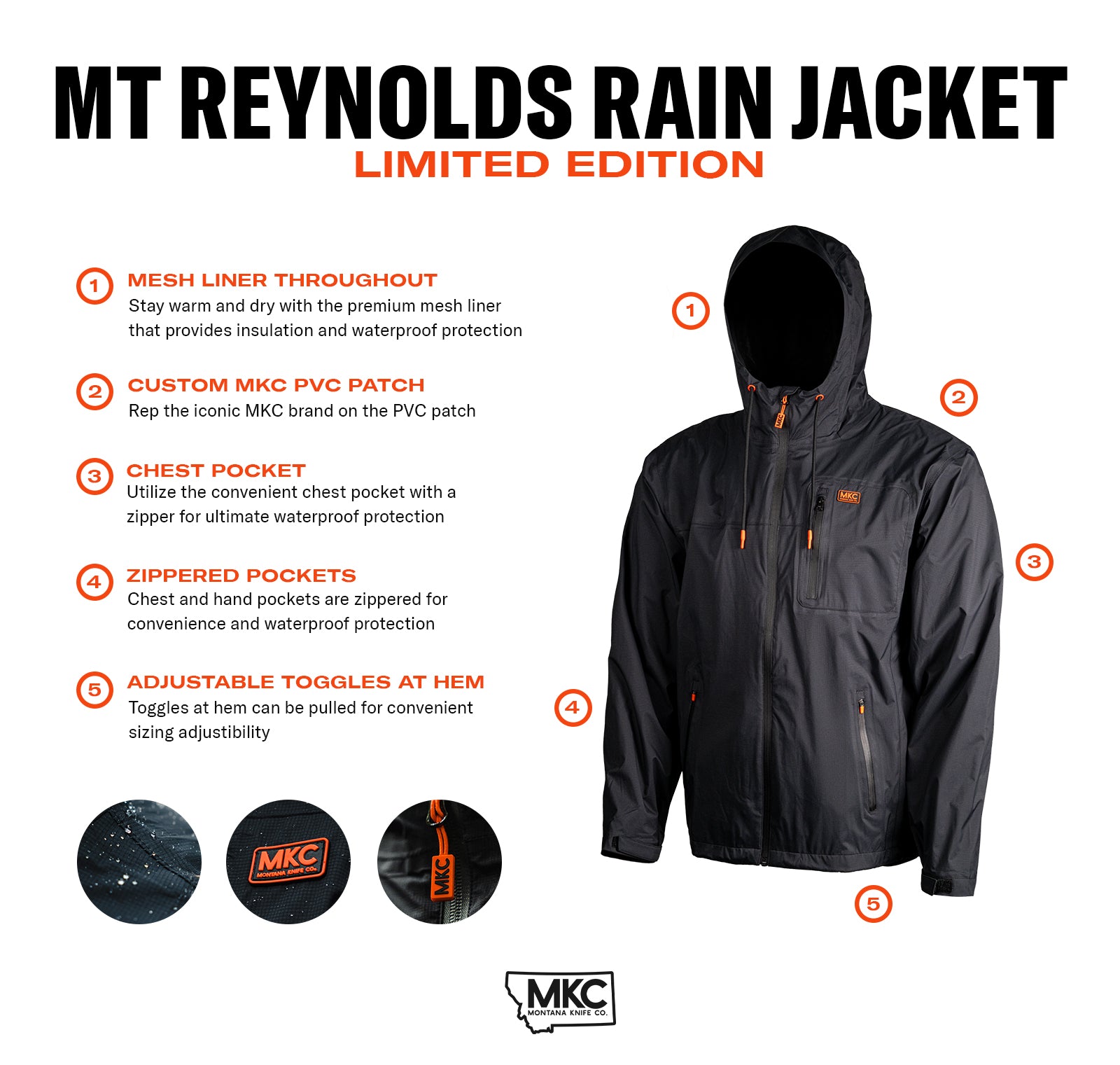 The Mt. Reynolds carries the same attention to detail you expect from every product we make. Custom MKC PVC patches and a custom MKC zipper pull mean you're wearing something built with intention, not just slapped together on an assembly line. This is a rain jacket that reflects what Montana Knife Company stands for: gear made to be used, not just worn.